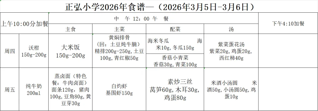 郑州高新区荣邦城小学营养午餐食谱(3月5日—3月6日)