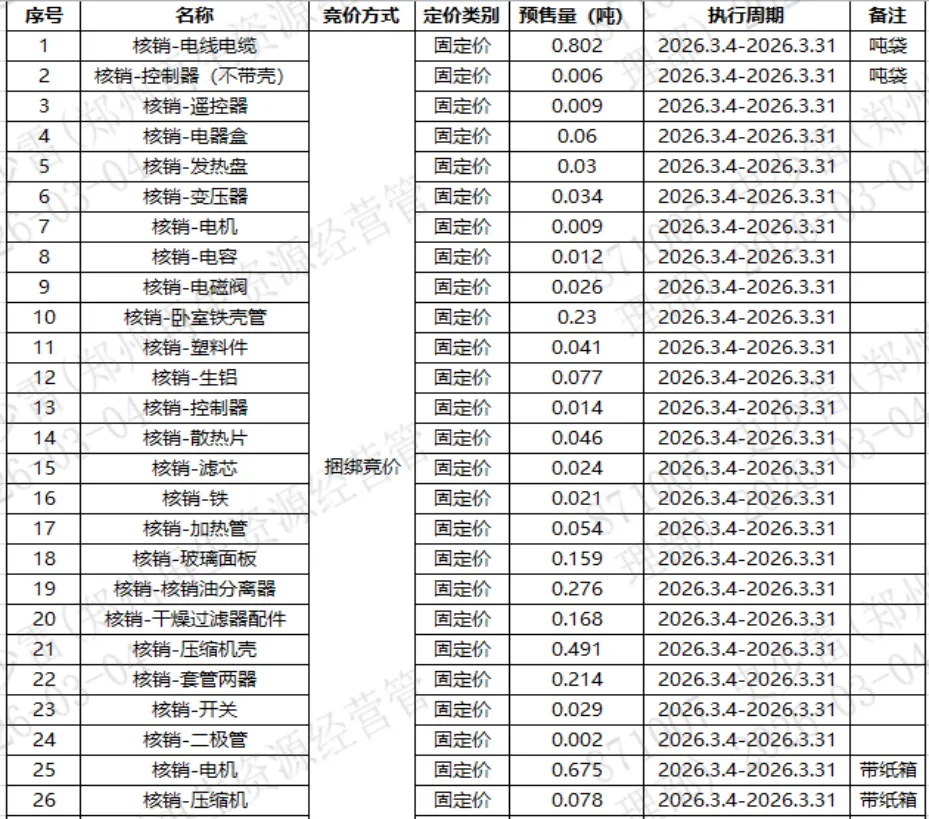 拟对以下物料价格进行竞价,下表中出售量仅供参考,最终数据以我司出售时过磅数量为准。竞价回收后,回收商不得以出售量与预估量不符提出任何异议。