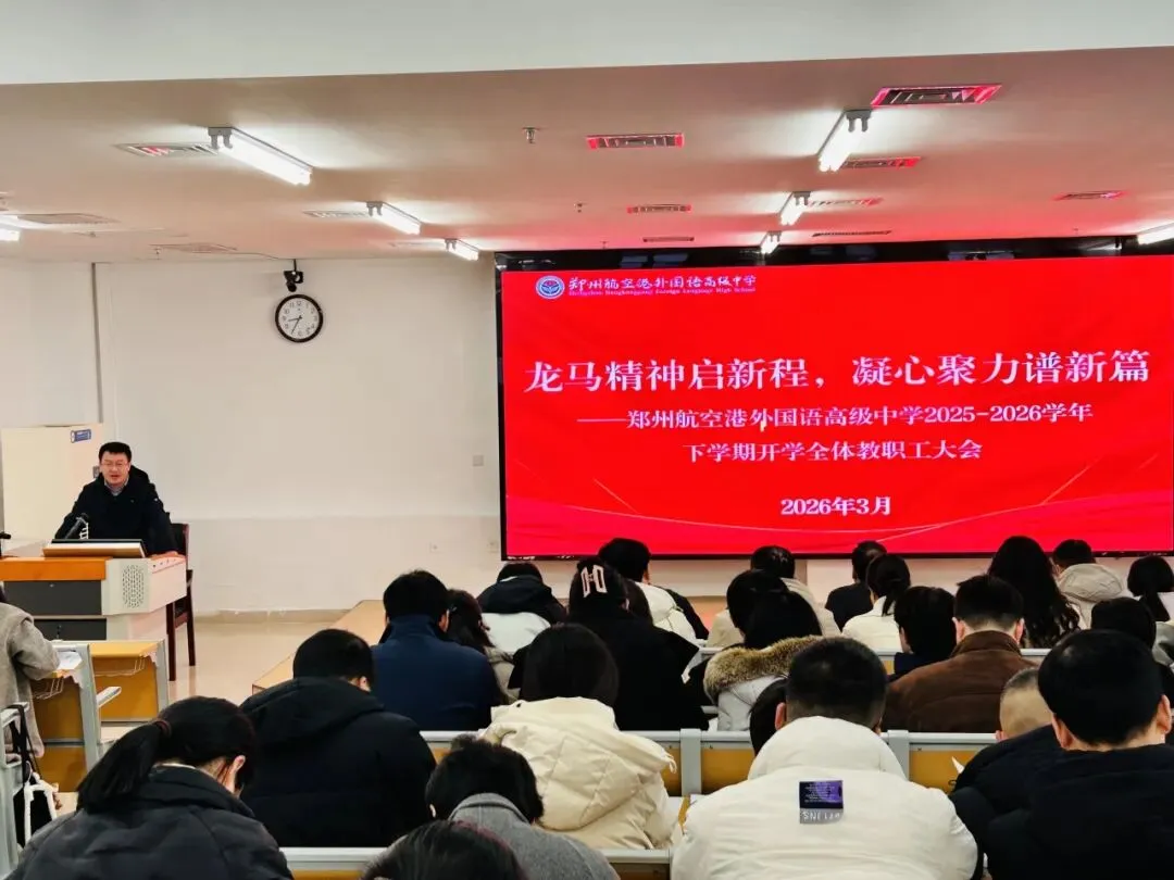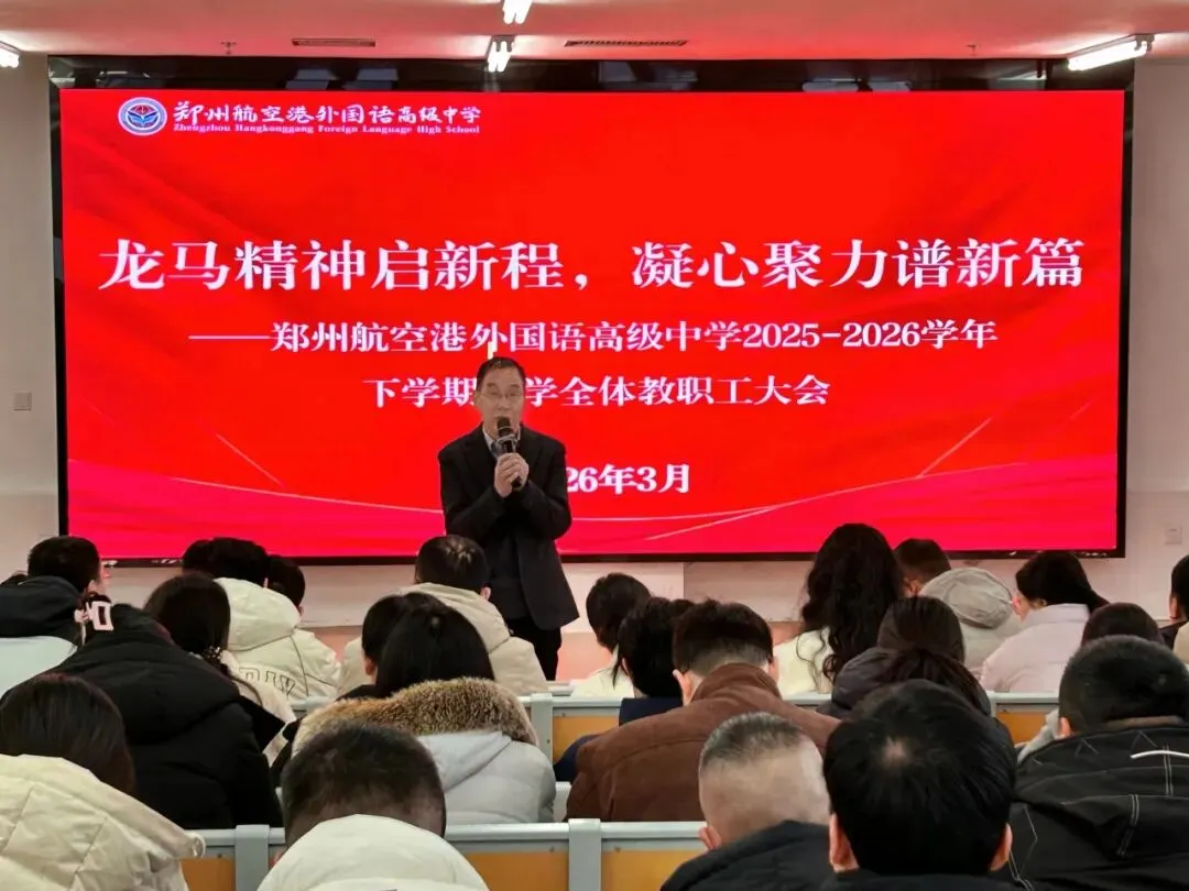 春风浩荡启新程,奋楫扬帆向未来。2026年3月3日上午,郑州航空港外国语高级中学新学期全体教职工大会隆重举行。本次大会由饶克副校长主持,以“龙马精神启新程,凝心聚力谱新篇”为主题,旨在统一思想、明确方向、振奋精神,为新学期各项工作开好局、起好步。