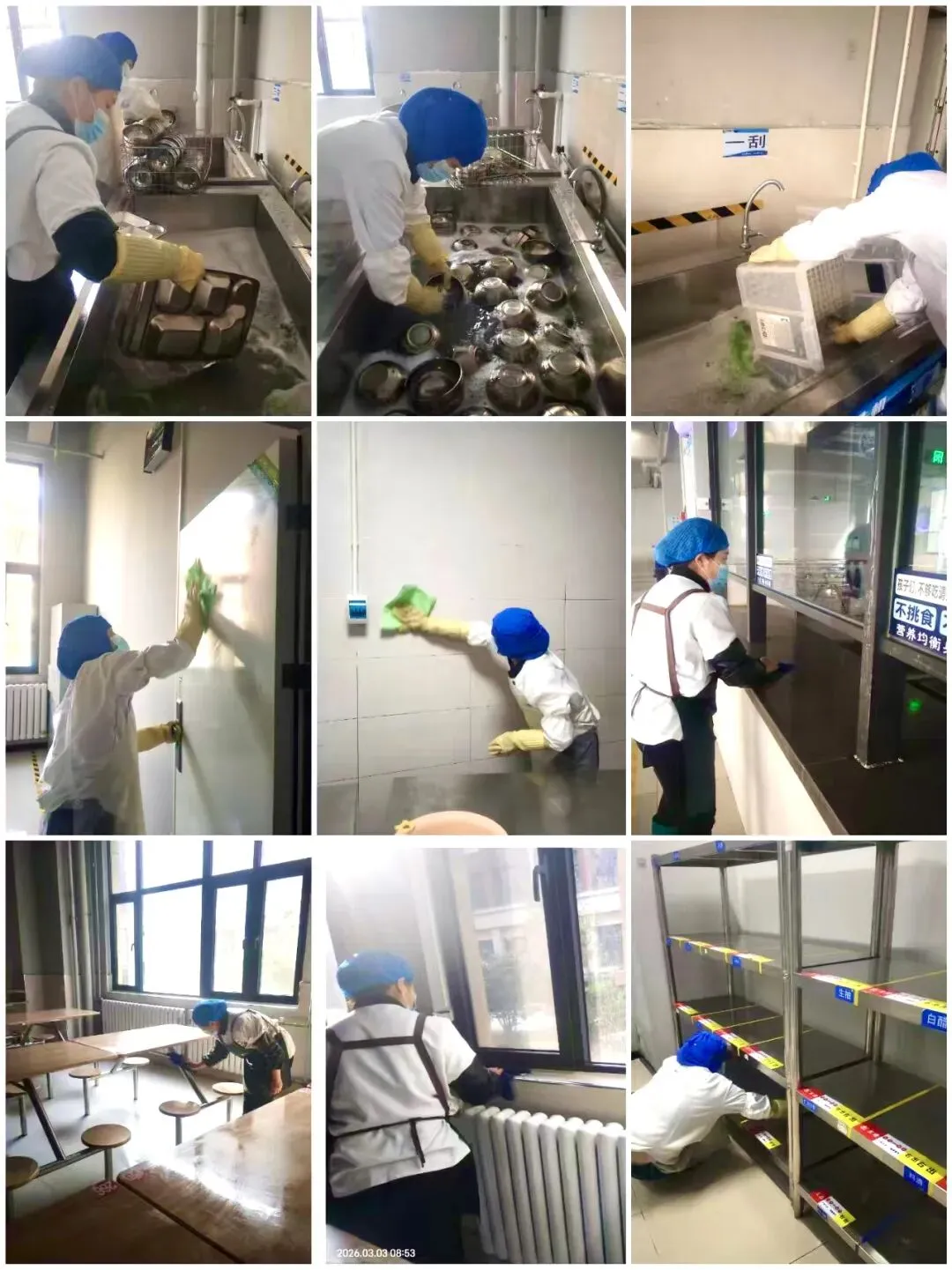食品安全齐监督,学生健康同构筑。开学前夕,学校食堂工作人员全面开展卫生整治行动,对餐厅操作间、就餐区、储物间等区域进行全方位、无死角清洁消杀,严格执行餐具清洗消毒流程,规范食材储存与加工标准,为学生的健康成长提供坚实的保证。