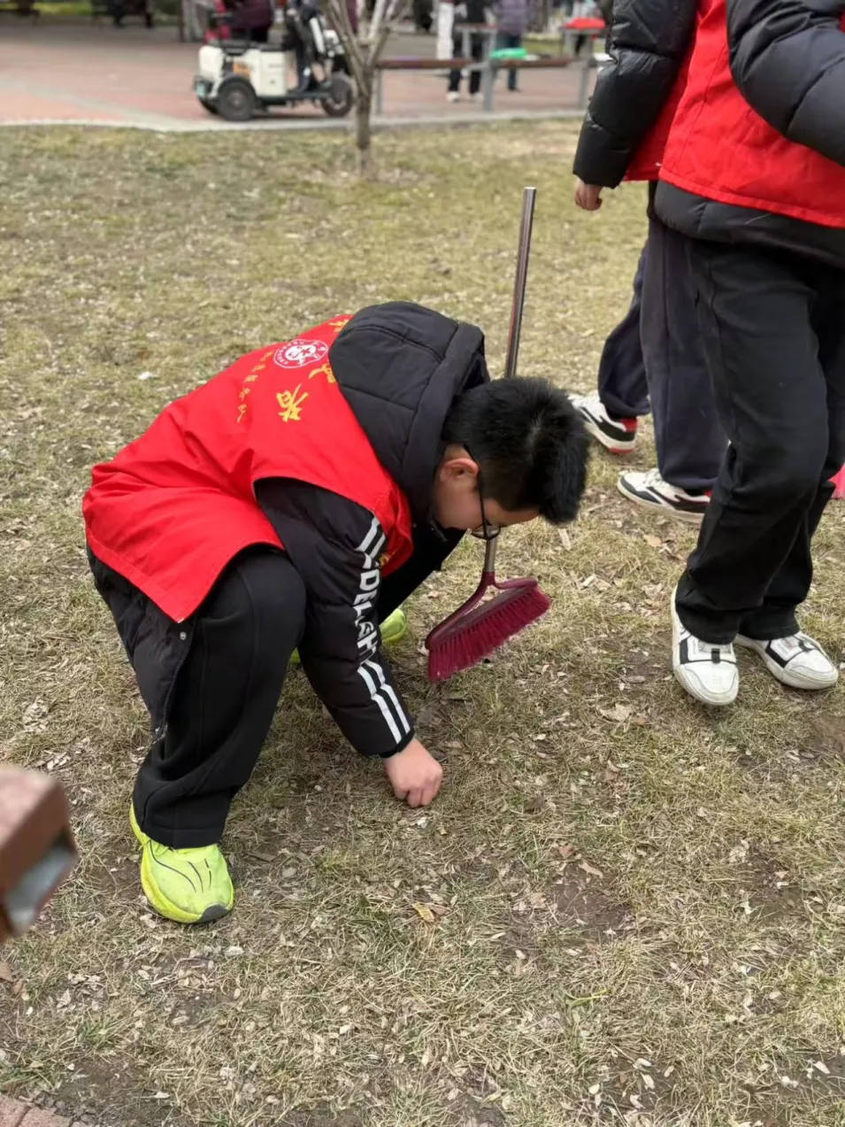 二十余名学生志愿者身着红色马甲,手持扫帚、簸箕、夹子等清洁工具,在带队老师的指导下,对五一公园绿化带进行集中清扫。同学们分工协作,有的清扫落叶杂物,有的捡拾白色垃圾,现场一派热火朝天的劳动景象。同学们热情高涨,认真细致地清理每一个角落,用实际行动践行"劳动最光荣"的理念。