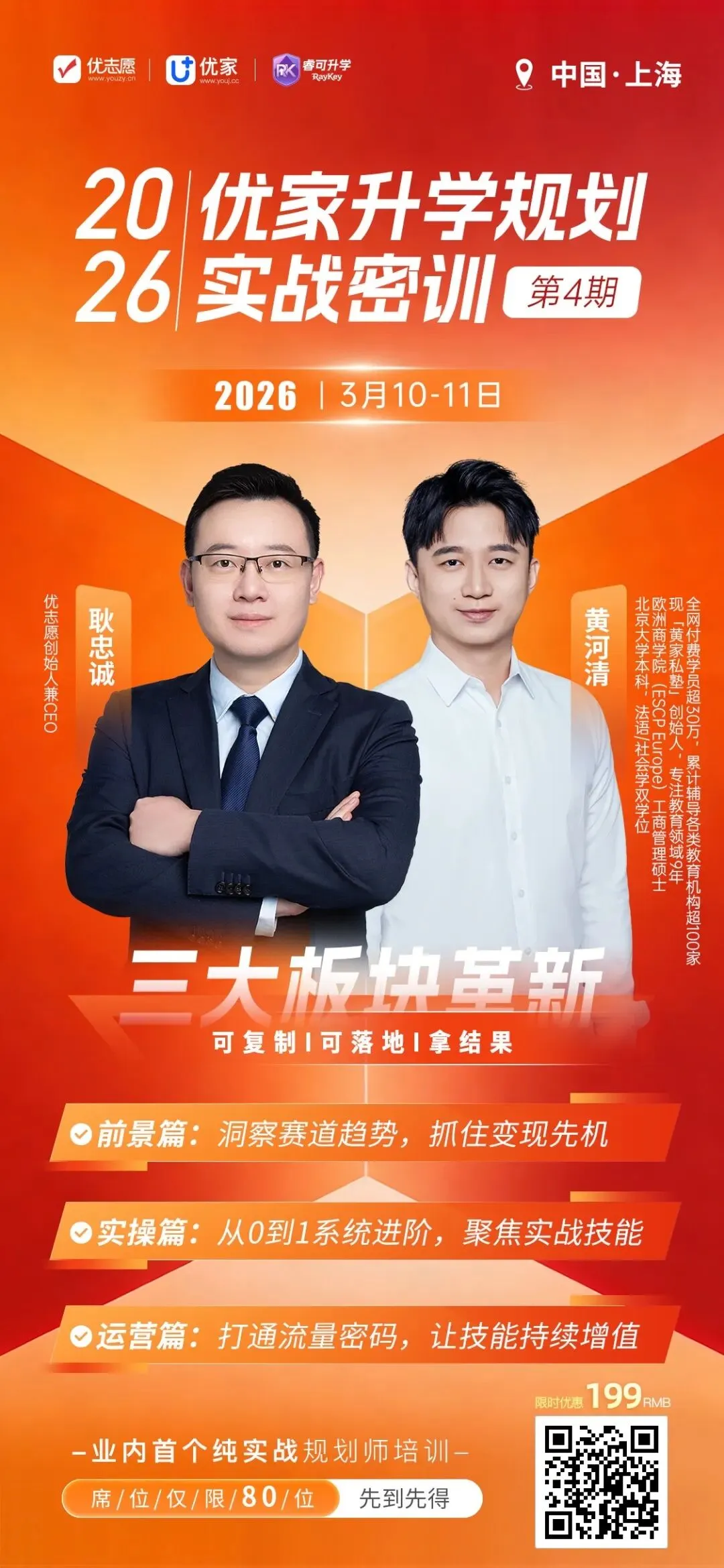 2026 年 3 月 4 日,优家升学规划实战密训・郑州站正式启幕!从行业趋势拆解、专业测评解读,到填报策略深耕、方案实操打磨,全程干货拉满,每一位学员都带着满满的收获,开启复盘与精进。优志愿创始人耿忠诚先生率先登场,以精准的行业洞察,为学员们深度拆解了 2026 年升学市场的前景与发展方向。课程中穿插多轮小组讨论,学员们结合所学分享思路、碰撞观点,更有小组代表上台现场解读测评报告,耿总现场点评指导,确保每一位学员都能听懂、学会、用得上,现场还为学员们准备了纸质版测评报告,学完即可直接落地到客户服务中。午休过后,学员们一同前往优志愿郑州分公司参观交流,实地感受优志愿的品牌实力与服务体系,近距离了解本地化升学服务的运营模式。下午资深填报专家 CICI 老师携海量最新真实填报案例登台,为学员们带来了全维度的志愿填报策略干货。从院校专业组的核心填报逻辑,到从就业倒推专业与院校的核心思路,再到 “冲 - 稳 - 保” 专业组与志愿表的搭建逻辑,CICI 老师结合多年实战经验,把复杂的填报知识拆解得通俗易懂,更以浙江历政生 5000 位次的真实考生案例,拆解了不同需求下的志愿表搭建方法,精准击中了规划师日常工作中的核心痛点。晚间的方案点评与互动答疑环节,耿总针对每组提交的填报方案逐一点评,结合不同学生画像的核心需求,给出了可直接落地的调整建议,更针对学员们提出的日常工作中的疑难问题,逐一耐心解答。没能赶上本次郑州站密训的老师也无需遗憾,优志愿第 4 期实战密训・上海站报名通道已全面开启!名额有限,满额即封班,扫描下方二维码即可锁定席位!