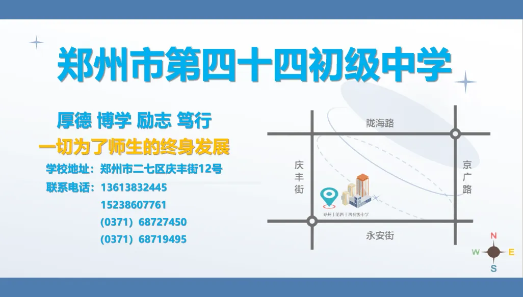 郑州市第四十四初级中学1973年建校,文化底蕴深厚。学校秉承“厚德 博学 励志 笃行”的校训,以“一切为了师生的终身发展”为办学理念,以质量立校、特色强校为发展路径,求真务实、破局创新。曾先后荣获:
