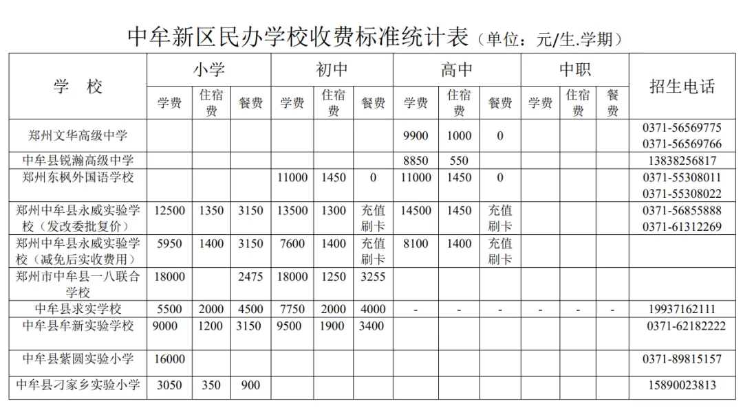 河南省-郑州市2026春季开学收费标准!