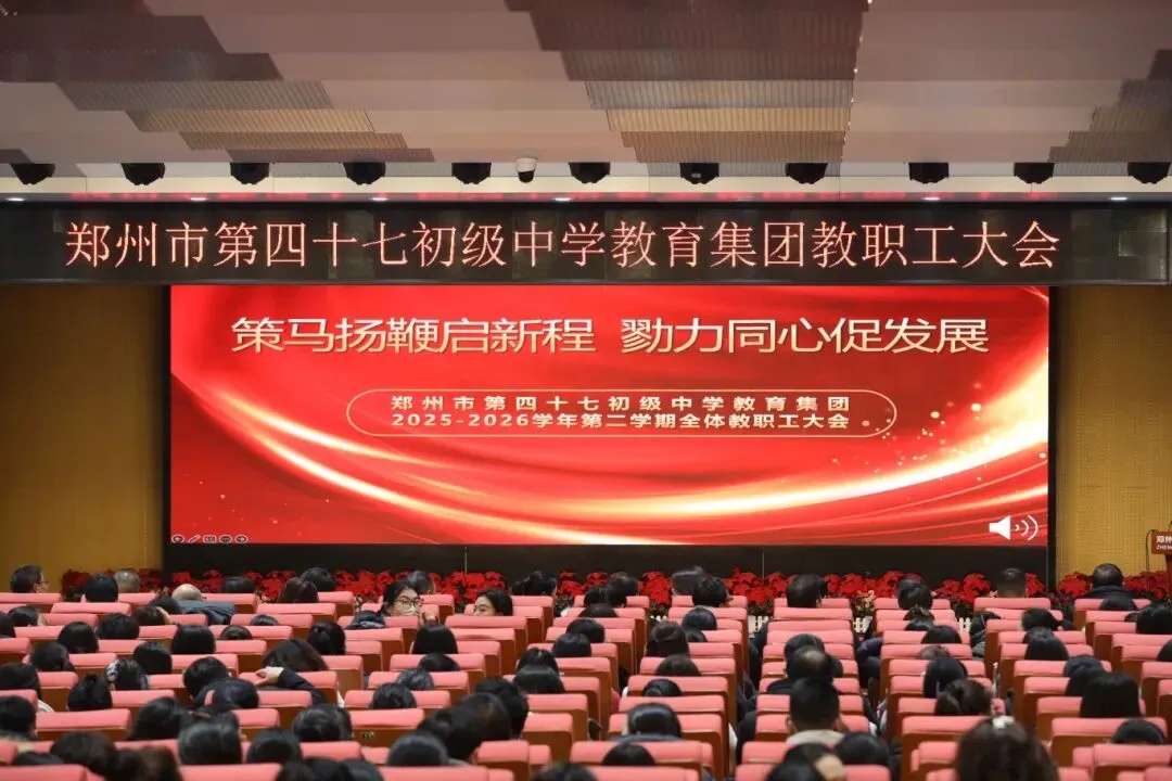 春启新程,奋楫扬帆。在万物复苏的美好时节,郑州市第四十七初级中学教育集团2025-2026学年第二学期全体教职工大会隆重举行,全体教师齐聚一堂,凝心聚力谋发展,笃行实干启新篇,为新学期教育教学工作吹响奋进号角。