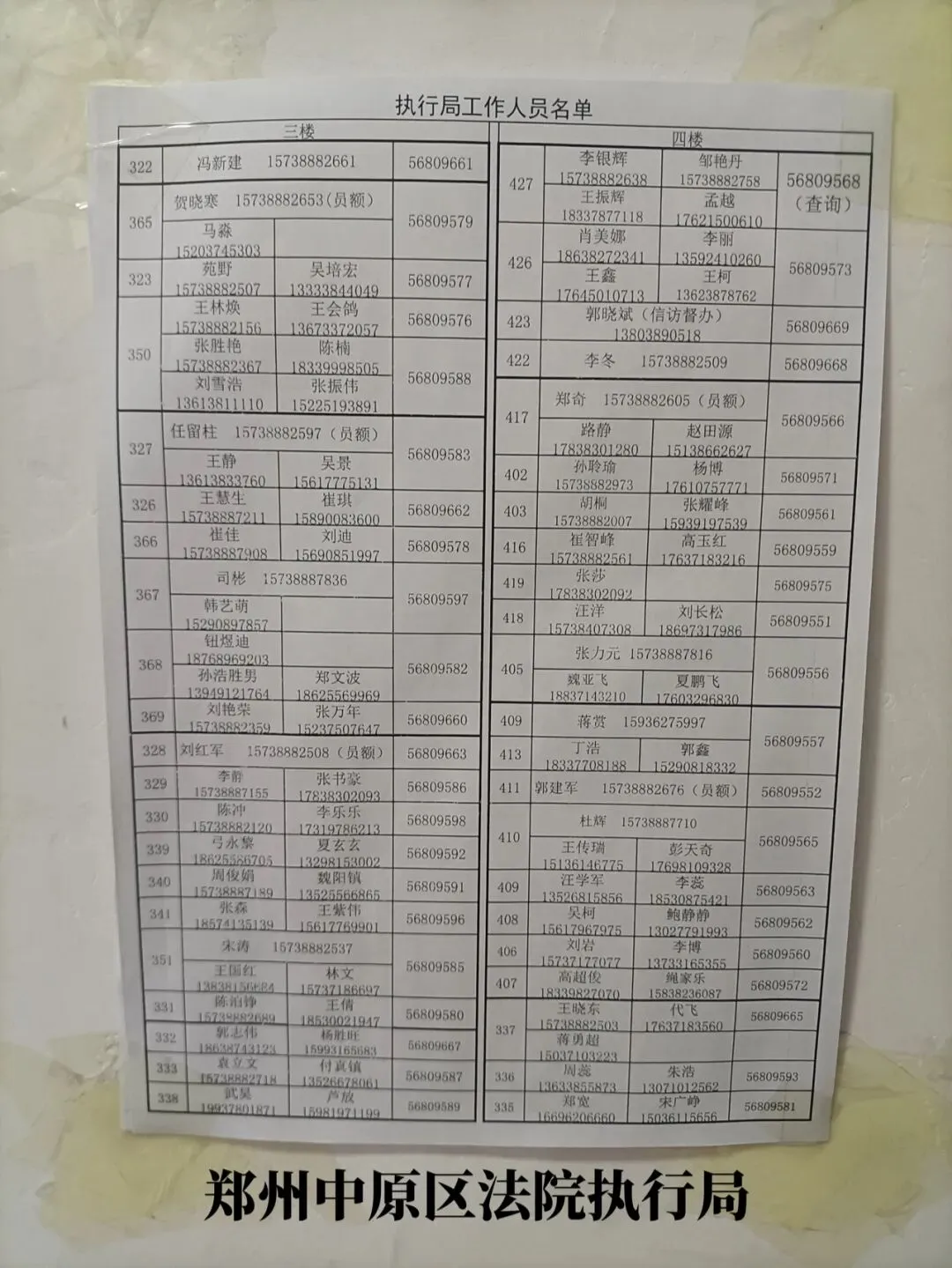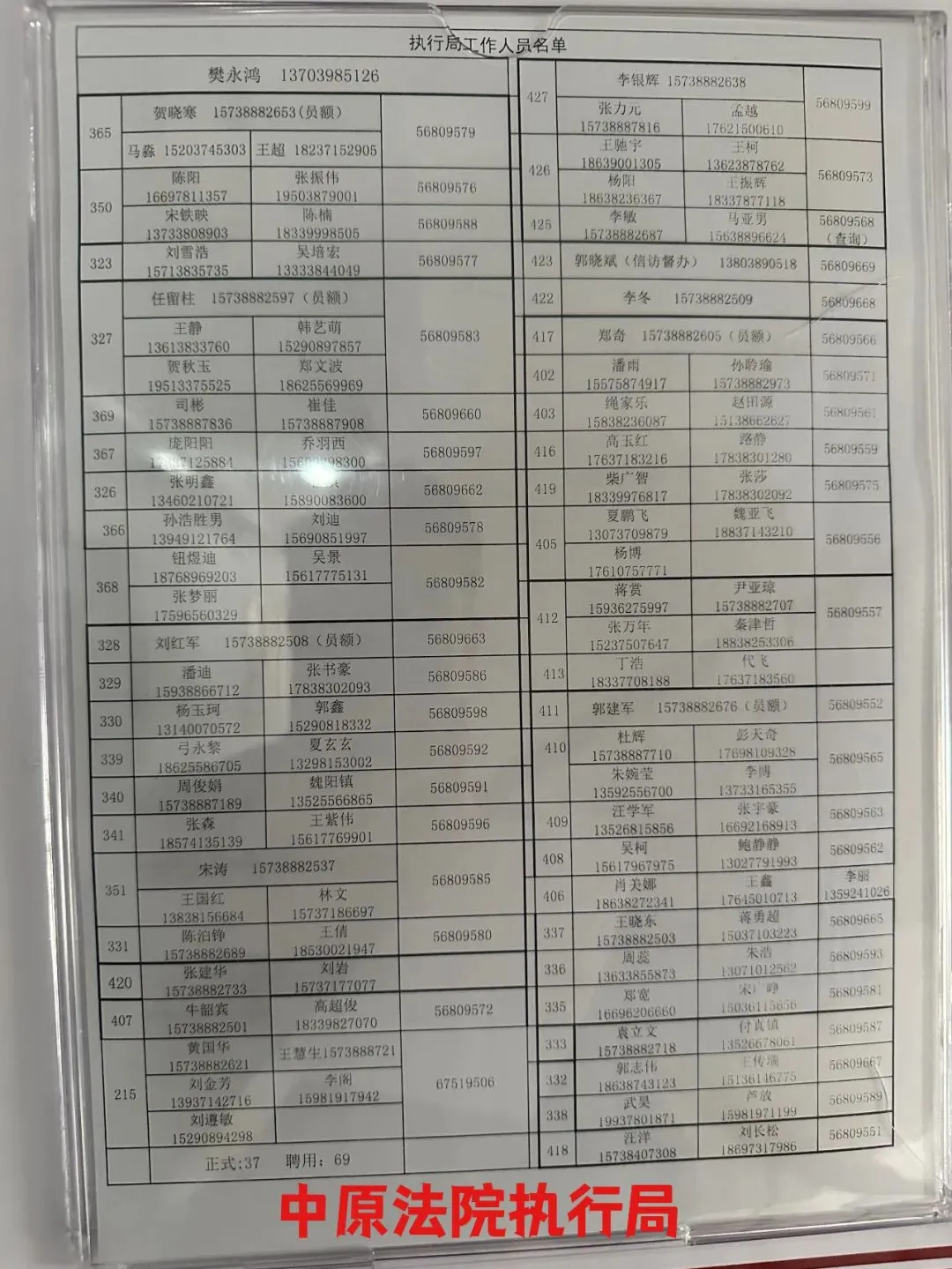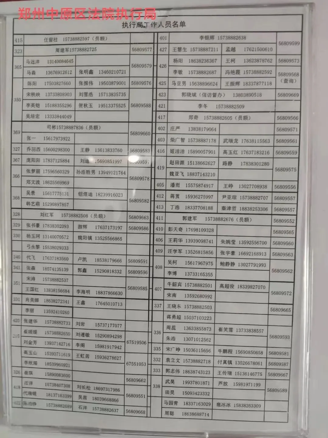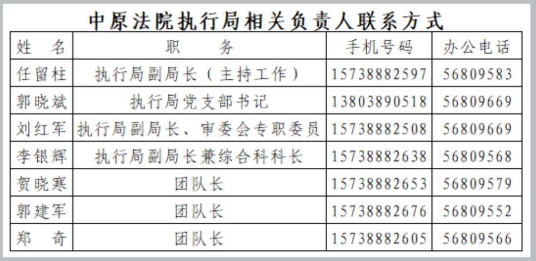 | 刘红军 | 执行局副局长 | 037156809663 | 15738882508 |