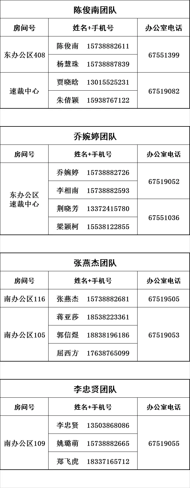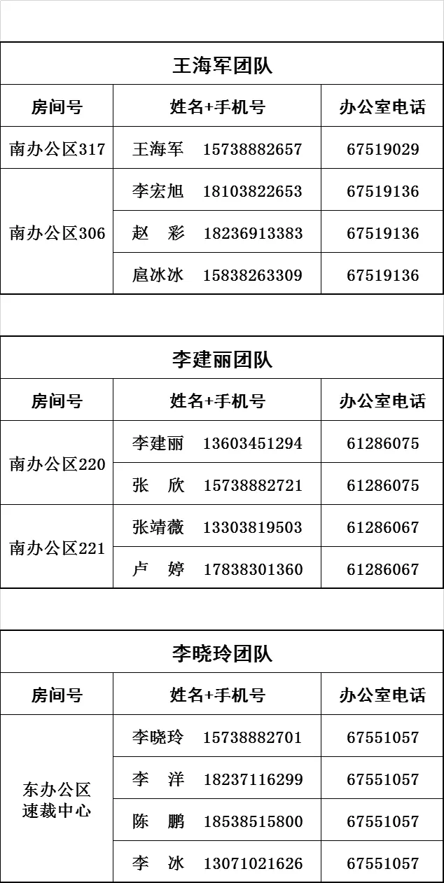 为大力推进审判工作公开化,切实维护当事人合法权益,推动审判工作高质量发展,现将我院审判办案团队联系方式公布如下:
