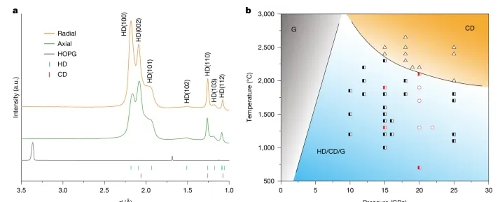 HD,又称六方金刚石,因其预测硬度超过CD,且具有作为陨石撞击矿物标志物的潜力而备受关注。自近60年前在峡谷迪亚布罗陨石中首次发现HD以来 ,人们已投入大量精力合成HD,方法包括高温高压(HPHT)处理石墨碳,或通过石墨样品的爆炸或冲击压缩。虽然热解石墨的冲击压缩已提供了HD存在的证据,但其局限性在于只能在压缩波传播过程中原位检测其离散的晶体结构,而压缩波随后会破坏样品。由于热力学稳定性,CD在天然和合成产物中均优先形成,仅少量存在HD或残留石墨。这些多相混合物通常通过X射线衍射(XRD)和选区电子衍射(SAED)数据进行鉴定,但由于其特征重叠,使得HD的精确鉴定变得复杂。一些研究表明,先前归因于HD的结构证据实际上可能对应于具有堆垛层错或纳米级孪晶的CD ,这引发了对HD相有效性的质疑。因此,HD的存在仍然存在争议且难以捉摸,这主要是由于制备块状纯HD相的挑战,阻碍了对其固有性质的进一步理解。