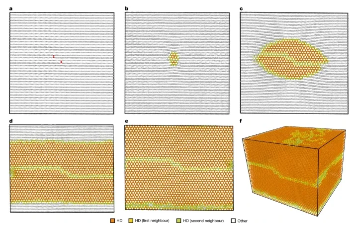 总之,通过在高温高压条件下压缩高定向热解石墨(HOPG)前驱体,成功合成了由堆叠纳米层构成的纯块状金刚石(HD)。结构和光谱分析,以及大规模分子动力学模拟,明确证实了HD的结构,并揭示了层间键合通过抑制基面滑移驱动石墨向HD的转变。HD的硬度值略高于金刚石(CD),同时具有高剪切模量和显著的热稳定性。这些发现不仅为极端条件下石墨向金刚石的转变提供了基础性的见解,而且为制备块状HD提供了一种实用策略。此外,它们可能有助于解释天然六方金刚石的罕见形成,并为HD在先进工业和地球科学领域的应用开辟新的可能性。
