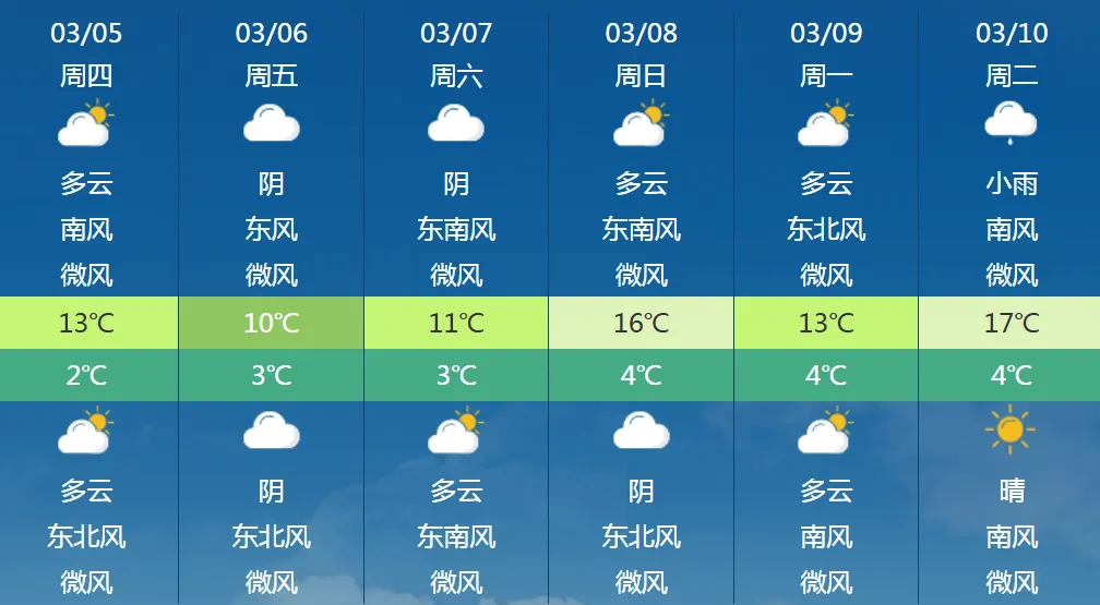 郑州市天气预报,今天:多云到晴天,偏东风转偏南风:2-3级,最低气温:4~5℃,最高气温:14~15℃。6日:多云转阴天,3~10℃。