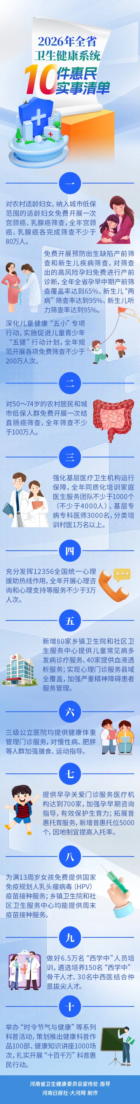 与健康有关!河南10件惠民实事清单公布→免费“两癌”筛查、满13岁女孩HPV疫苗免费接种、基层医疗服务升级……近日,2026年全省卫生健康系统10件惠民实事清单发布,覆盖妇女、儿童、老人、慢性病患者等重点人群。具体每件实事包含哪些福利?哪些人可以享受?一起来看。