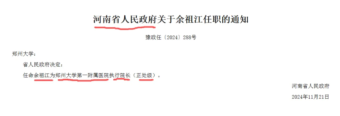 郑州大学第一附属医院的排名和影响力都比河南省人民医院大,并且这两个医院在全国的影响力都比较大,特别是郑州大学第一附属医院,号称“宇宙第一大医院”。郑州大学第一附属医院为什么被称为“宇宙第一大医院"?因为它的规模真的很大,床位数一度超过万张,年手术量常年超过30万台,年门急诊量常年在700万人次以上,遥遥领先于其它医院。郑州大学第一附属医院在复旦版《2022年度中国医院综合排行榜》上排名第19名,河南省人民医院排名第84名。郑州大学第一附属医院在最新的2024年复旦版《中国医院综合排行榜》上,也进入了最高等级A++++级榜单,与北京协和医院、四川大学华西医院、中国人民解放军总医院、上海交通大学医学院附属瑞金医院、复旦大学附属中山医院等知名医院排在一个等级。而河南省人民医院在2024年复旦版《中国医院综合排行榜》上,只进了第五等级——A级榜单。但郑州大学第一附属医院和河南省人民医院的行政级别均为副厅级,其党委书记和院长均是副厅级干部。有许多人觉得郑州大学第一附属医院影响力如此之大,就觉得它的行政级别是正厅级,但这并不正确。也有不少人认为郑州大学第一附属医院是郑州大学的附属医院,就觉得它的行政级别只是正处级。就像四川大学华西医院、中南大学湘雅医院一样,只是大学的二级机构,院长和党委书记任命是由大学自行任命。这当然更不对了。郑州大学第一附属医院为郑州大学的附属医院,由郑州大学举办,从国家事业单位网站上也能查询到郑大附一院的举办单位为郑州大学。但2012年郑州大学第一附属医院成为了省部共建医院,意思就是医院由河南省政府、郑州大学、原卫生部共同建设,各自分工。郑州大学是举办单位,负责教学、科研、学科建设和医教协同,郑大第一附属医院加挂郑州大学第一临床学院牌子。医院是郑州大学医学教学科研的主体。河南省政府是医院的主管单位,掌握人事、财政、资产、重大决策等核心权力。郑大第一附属医院的人事任免、财政投入、编制管理等核心事权归河南省政府。这种"举办权在大学、主管权在政府"的模式,也是中国省属高校附属医院的主流模式。因此,郑大第一附属医院的党委书记和院长的任命都是由河南省省委或省政府进行的。通常来说,省委或省政府任命的干部一般都是厅级干部(副厅级或正厅级),只有像区县县委书记和少部分地区的县长以及有些省直副厅级单位的重要副职,这些重要的正处级干部也是省委或省政府任命。首先,不仅其院长由河南省政府任命,其副院长也是由省政府任命,这是标准的厅级(正厅级或副厅级)单位才有的规格。如果是正处级单位,是不可能由省政府直接任命正职和副职的。2022年4月河南省人民政府任命郑大第一附属医院几名副院长,其中也有后来担任了执行院长和现任院长的余祖江,见下图。2024年河南省人民政府又任命余祖江为郑大第一附属医院执行院长,并且标注了级别为正处级,见下图。这里的执行院长的级别实际上就是副院长的级别,但排位在院长后面,其他副院长前面。这里多说一句,为什么这里任命时要特别标注级别为正处级了?我觉得执行院长应该是一个临时的、过渡的职位,郑大第一附属医院“三定”方案里面可能并没有这个职位设置,所以这种临时的、过渡的职位,要标注出行政级别。而院长、副院长这些职位,在三定方案里面已明确了行政级别,省政府任命时,如果其级别和三定方案里面一致,就不会再单独标注行政级别了,而默认为就是三定方案里面的行政级别了。这也是为什么有些985大学的校长、书记,中央或国务院在任命时,会在后面加括号(副部级),因为它们的行政级别和三定方案里面的行政级别不一致。985大学其单位行政级别只是正厅级,三定方案里面校长、书记的级别也只应为正厅级,高配为副部级,所以要特别标注出来。从郑大第一附属医院现任院长余祖江,在担任郑大第一附属医院的执行院长(相当于排位第一的副院长)时的级别为正处级,也可以看出,副院长为正处级,那么院长就为副厅级。这也算是省政府任命省直副厅级单位重要副职(正处级)的一个案例。另外,从郑州大学官网上2026年2月5日的新闻可以看出,原郑大第一附属医院的院长姜勇已调任到郑州大学任学术副校长(见下图)。这也可以看出郑大第一附属医院的院长级别为副厅级,因为郑大副校长的级别就是副厅级。从河南省人民医院现任院长和书记郝义彬的经历来看,他是由河南省疾病预防控制中心的主任调到河南省人民医院任院长的。见下图:河南省疾病预防控制中心的行政级别是副厅级单位(见下图),其主任的行政级别已是副厅级了,所以河南省人民医院的院长级别也不会低于副厅级。由于河南省人民医院是河南省卫健委的直属医院(见下图),其行政级别比河南省卫健委低一级为副厅级也合情合理。比较有意思的是,我在河南省人民医院的官网上未找到领导班子,这个栏目设置,这是很少见的。我觉得这个医院的领导班子还是挺低调的。作者提示:个人观点,仅供参考。素材来源官方媒体/网络新闻。