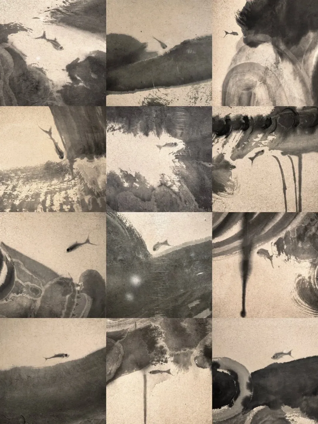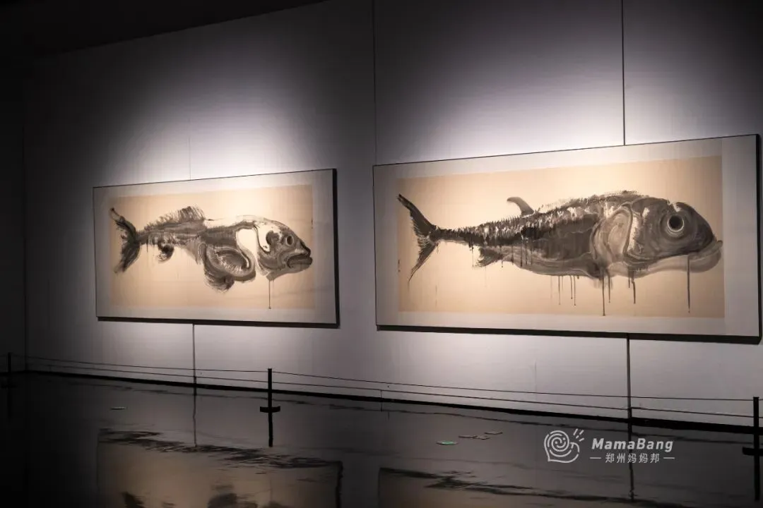这次展出很震撼,全都是丈二大的宣纸,宏阔有力,渲染、构建出一个个灵动而充满张力的“鱼”世界。