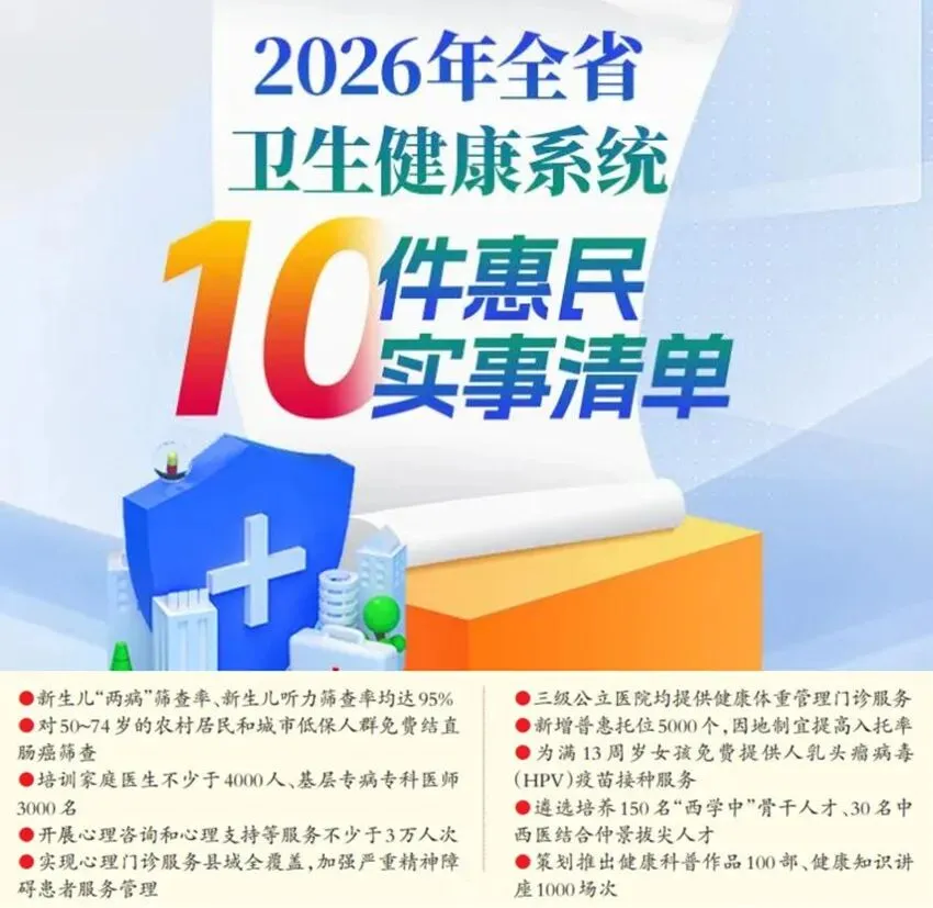2026年河南省卫生健康系统10件惠民实事清单昨天发布,包括免费“两癌”筛查、适龄女孩HPV疫苗免费接种、基层医疗服务升级等多项实事,覆盖妇女、儿童、老人、慢性病患者等重点人群。