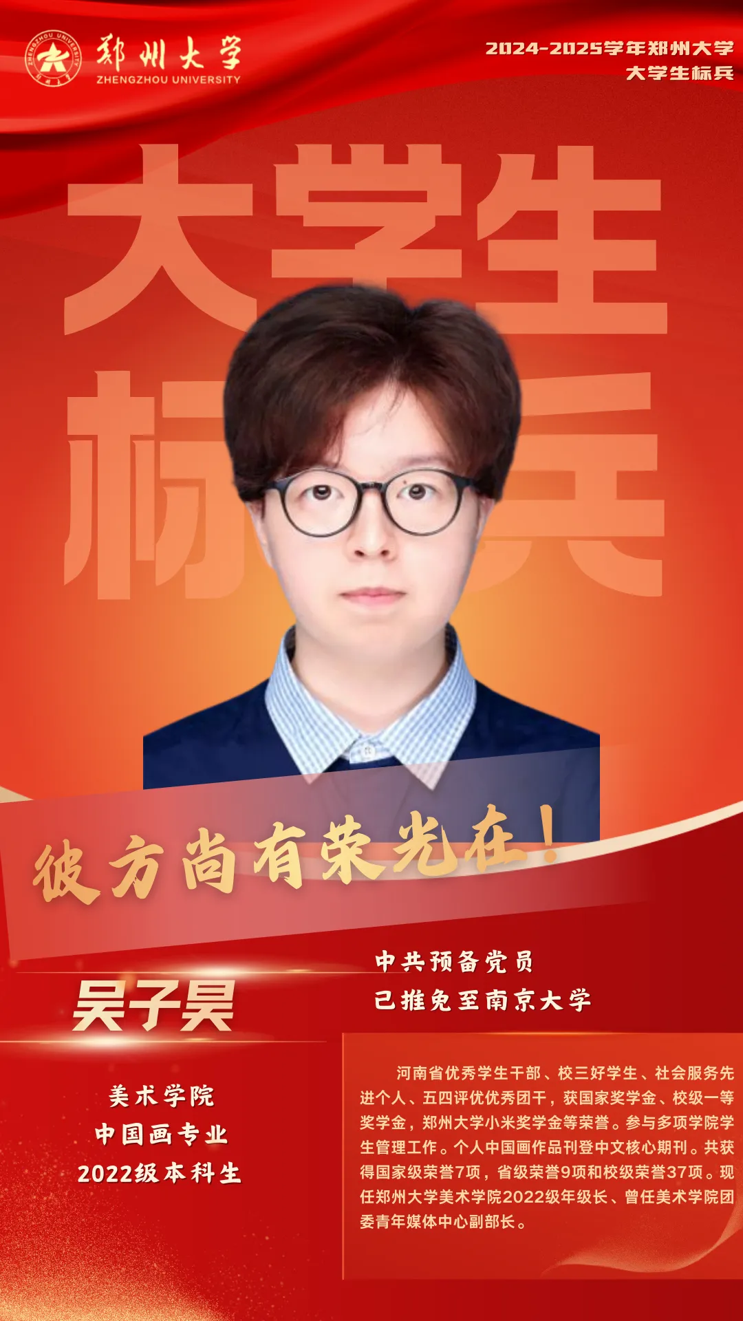 从专注于笔墨技法的学习者,到用艺术传递力量的践行者,吴子昊始终带着那份刻在骨子里的积极,守着对绘画的热爱稳步前行。“彼方尚有荣光在”,他用大学时光证明,热爱可抵岁月漫长,坚定的奔赴终会遇见属于自己的荣光。愿每一个心怀热爱的人,都能如他这般,以积极为翼,在热爱的道路上步履不停、向阳而生!