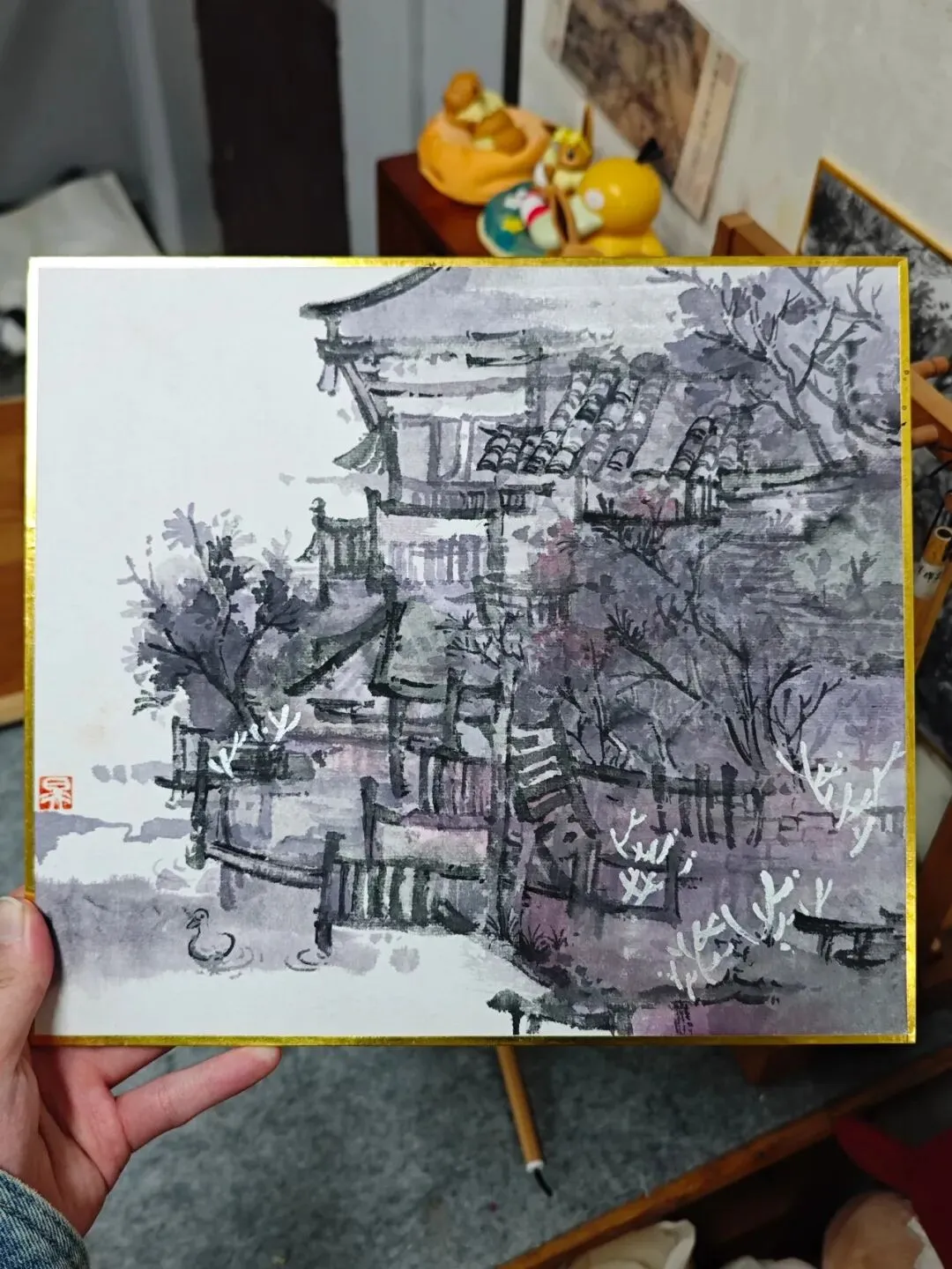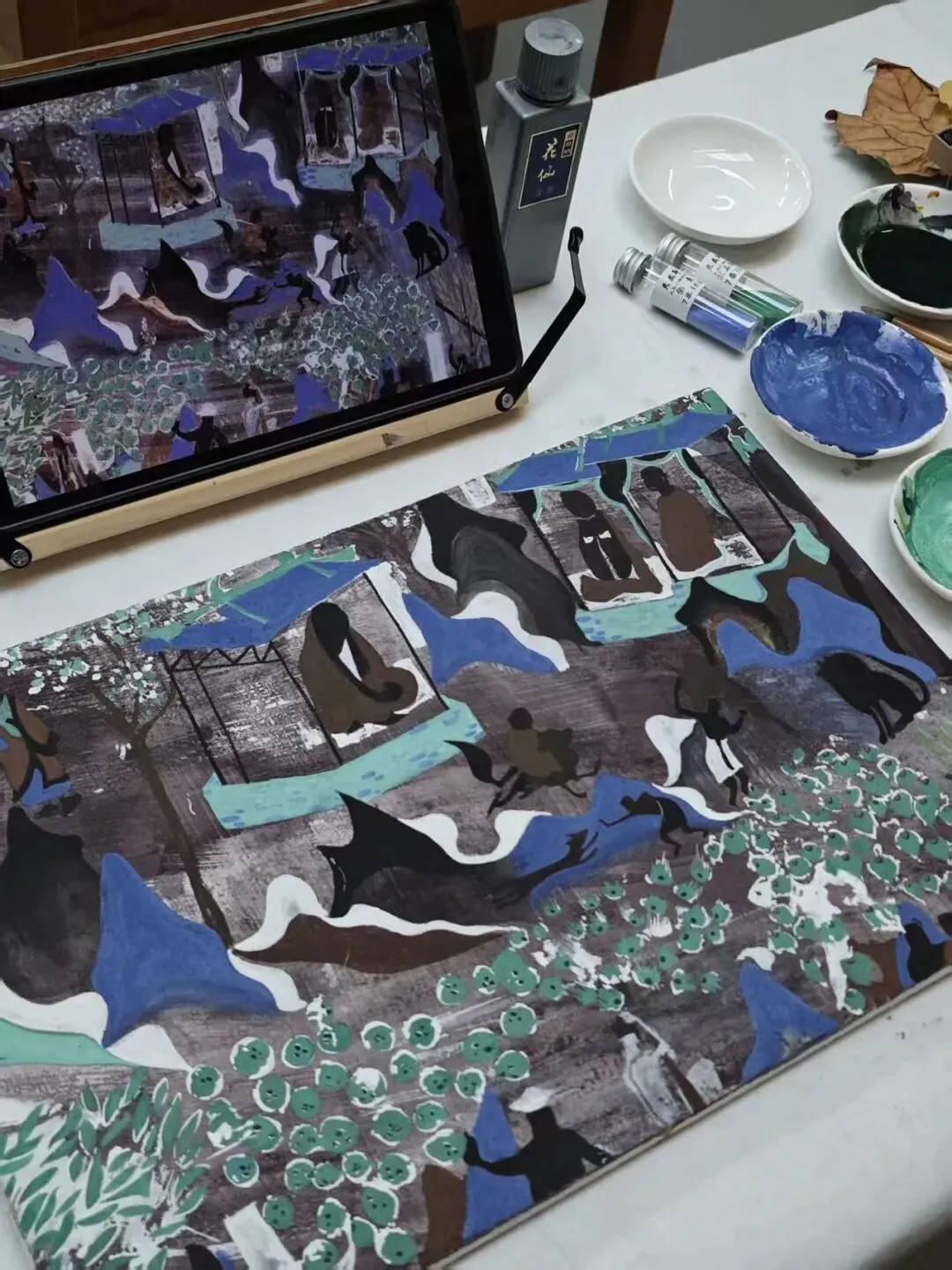 于吴子昊而言,绘画早已刻进日常的生活方式,画室里属于自己的小工位,便是他安放这份热爱的专属天地。这里常年萦绕着笔墨的味道与色彩的肌理,每一次灵感,都会在这里被细细打磨、沉淀。在“临摹、写生、创作三位一体”的学习体系指引下,他沉下心钻研古画笔墨的精妙,潜心研读艺术理论文献,即便是很久以前开启的作品,也会反复增添笔触、修改完善,直到达到心中的标准。