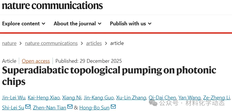2025年12月29日,郑州大学苏石磊、吉林大学田振男、孙洪波在国际知名期刊Nature Communications发表题为《Superadiabatic topological pumping on photonic chips》的研究论文,Jin-Lei Wu、Kai-Heng Xiao、Xiang Ni为论文共同第一作者,苏石磊、田振男、孙洪波为论文共同通讯作者。