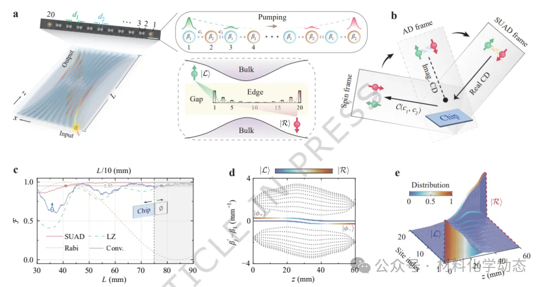 图1:调制光子波导中SUAD拓扑泵浦的示意图。a)左下角面板:在玻璃内部制造的空间调制SSH晶格光子波导示意图;左上角面板:输出端波导制造样品的照片(比例尺:20 µm);右上角面板:有限格点SSH晶格示意图;右下角面板:说明占据SSH晶格边缘的两个能隙保护模式的光谱示意图。b)片上拓扑泵浦与能隙模式赝自旋特定相互作用图像之间的示意关系。AD:绝热;CD:反绝热。c)四种拓扑泵浦方案在20个波导中随样品长度变化的保真度比较,其中传统绝热情况(Conv.)的长度值除以十。d)本征模式相对于β1的瞬时传播常数。能隙中的边缘模式杂化为|φ±⟩。e)沿SUAD路径|Φ−(z)⟩在每个波导上的激发瞬时分布。c、d和e中的数据基于完整哈密顿量