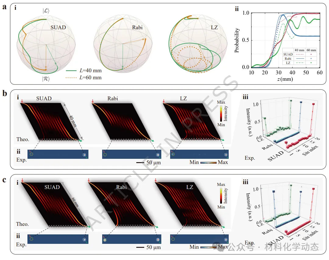 图2:SUAD拓扑泵浦的加速性能。(a) (i) 三种泵浦方案在L=40和60 mm时,边缘模式|L⟩和|R⟩在布洛赫球上的赝自旋动力学;(ii) 系统演化过程中|R⟩的占据概率,L=40和60 mm。(b) (i) 理论计算的光传播;(ii) 实验捕获的输出端面强度;(iii) 三种泵浦方案下L=40 mm样品的实验光强分布。(c) L=60 mm时(b)的对应结果。a、b(i)和c(i)中的数据通过用完整哈密顿量