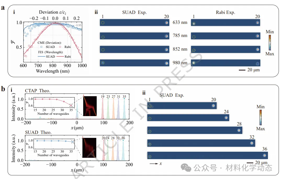 图3:SUAD拓扑泵浦的宽带和可扩展性能。(a) (i) SUAD方案(L=60 mm,顶部阴影区表示F > 0.95)和拉比振荡方案(L=40 mm)在输入波长范围为600 nm至1000 nm时的预测泵浦保真度;(ii) 两个样品在四个指定波长(而非808 nm)下工作时,在输出端面拍摄的照片。(b) (i) 相干拓扑绝热泵浦(CTAP,上图)和SUAD(下图)泵浦方案在不同波导数量下,计算的输出端面光强分布。插图:CTAP和SUAD方案在不同波导数量下的泵浦保真度趋势。N=35(CTAP)和N=36(SUAD)时的光传播模式。(ii) 五个分别具有N=20、24、28、32和36个波导的样品在输出端面的实测照片。a(i)中的F-波长数据和b(i)中的强度数据通过有限元模拟(FES)获得。a(i)中的F-ε数据和b(i)插图中的F数据通过求解CME获得。