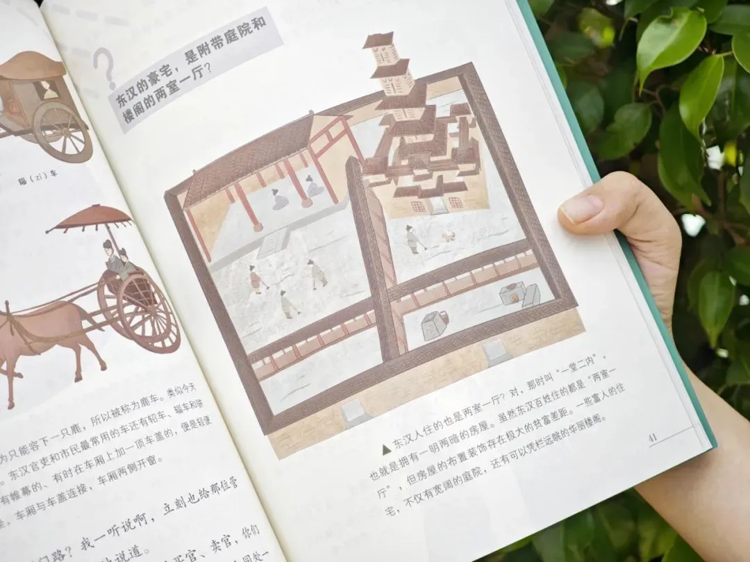 比如光靠文字描述,孩子很难想象的古代建筑一目了然:东汉时期的豪宅,是附带庭院和楼阁的两室一厅。富人的家里还有宽阔的庭院,以及可以凭栏眺望的华丽楼阁。