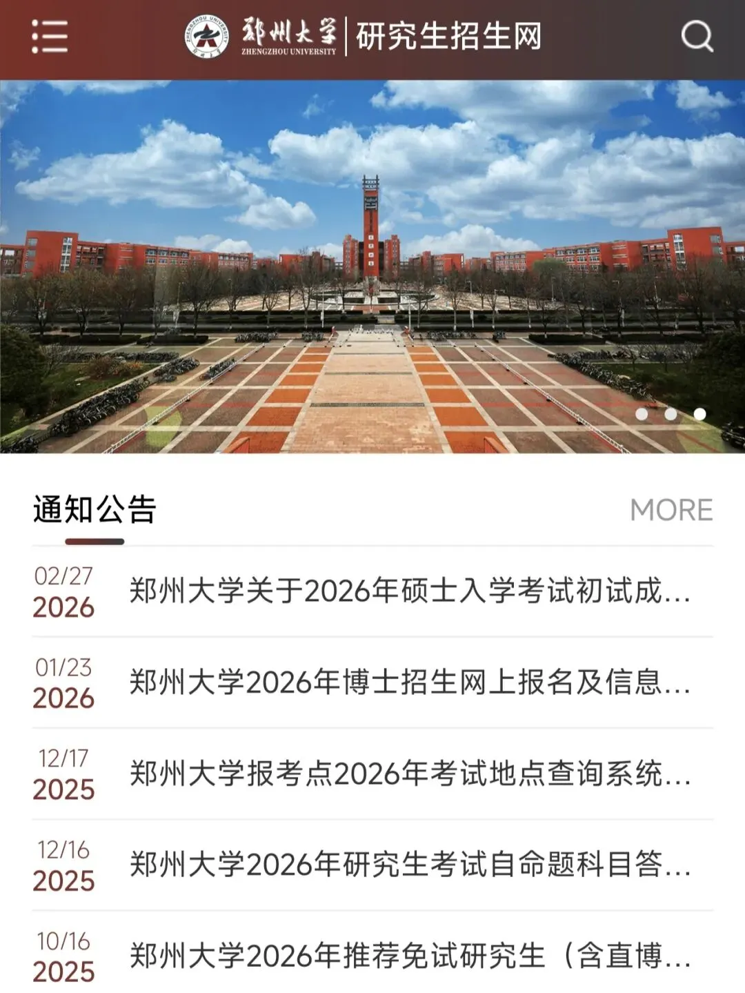 郑州大学关于招收研究生的所有通知都会放在这个网站上,像招生简章、报名、录取情况、调剂信息等都会在这个网站上通知。