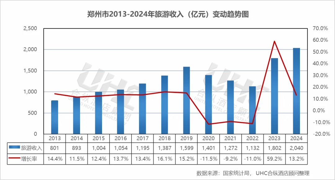 从旅游收入来看,2013-2019年收入从801亿元持续增长至1599亿元,年均增速保持在11%-16%的高速增长区间,反映出郑州作为华夏文明重要发祥地的强劲增长势头。2020年因疫情影响骤降至1401亿元(-11.5%),2021年继续回落至1272亿元(-9.2%),2022年进一步下滑至1132亿元(-11.0%),三年疫情对郑州旅游业形成持续冲击。2023-2024年连续爆发式增长,2023年跃升至1802亿元(+59.2%),2024年达到2040亿元(+13.2%),不仅超越疫情前水平,更创下历史新高。