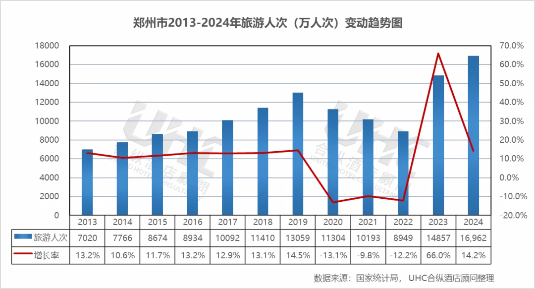 从旅游人次来看,2013-2019年人次从7020万持续增长至13059万,年均增速保持在10%-15%的高速增长区间。2019-2022年峰值13059万人次(2019)与谷值8949万人次(2022)的差距高达4110万人次,振幅达31.5%。2022-2023年从8949万人次猛增至14857万人次,增速高达66.0%,这一增速印证了郑州"华夏古都"城市IP在社交媒体时代的超强引流能力。2023-2024年首次突破1.69亿人次大关(16962万人次),较2019年增长29.9%,标志着郑州正式迈入"亿级"旅游目的地俱乐部的新高度。