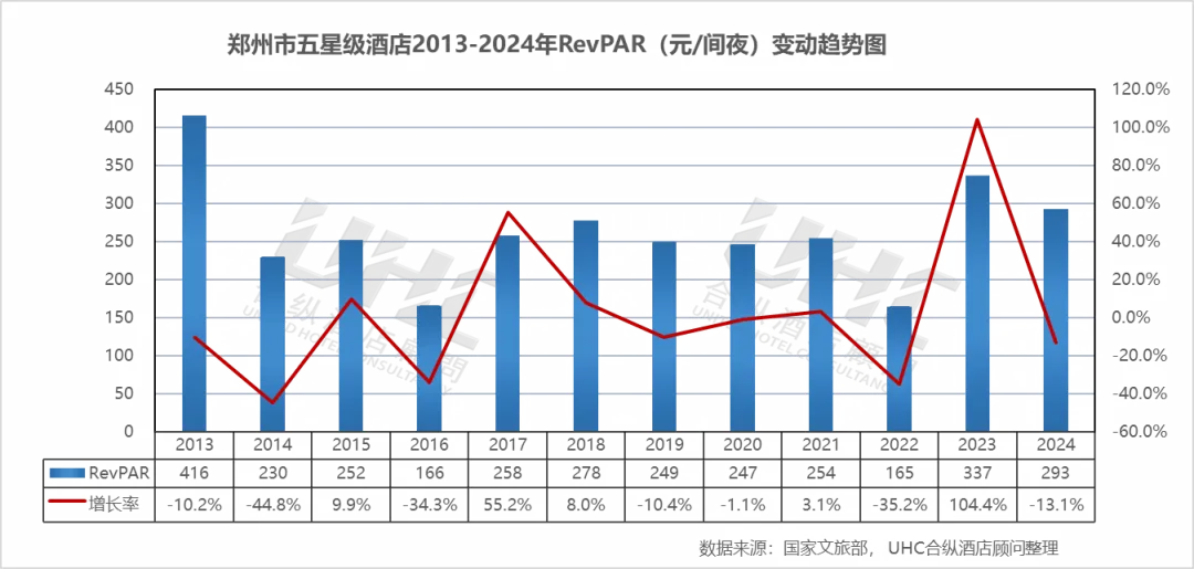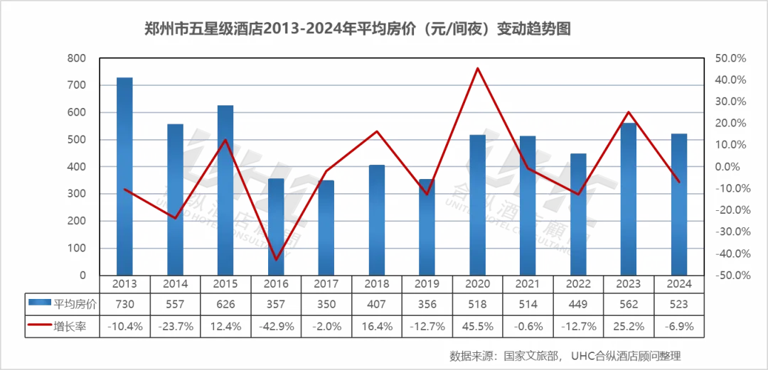 郑州市五星级酒店2013-2024年的平均房价为496元,其中最高为2013年的730元,最低为2017年的350元。从变动情况来看,2013年房价达峰值730元,2014年骤降至557元(-23.7%),2016年进一步暴跌至357元(-42.9%),反映早期市场供给激增与价格战激烈。2017-2019年在350-407元区间震荡,市场逐步寻底。2020年逆势反弹至517.56元(+45.5%),主要源于供给侧收缩(部分酒店关停或调整星级)及样本结构变化。2021-2022年再次回落至449元,2023年强劲反弹至562元(+25.2%),显示商务与会展需求的快速恢复。2024年微调至523元(-6.9%),表明市场在高位运行中趋于理性,但仍显著高于2016-2019年水平。