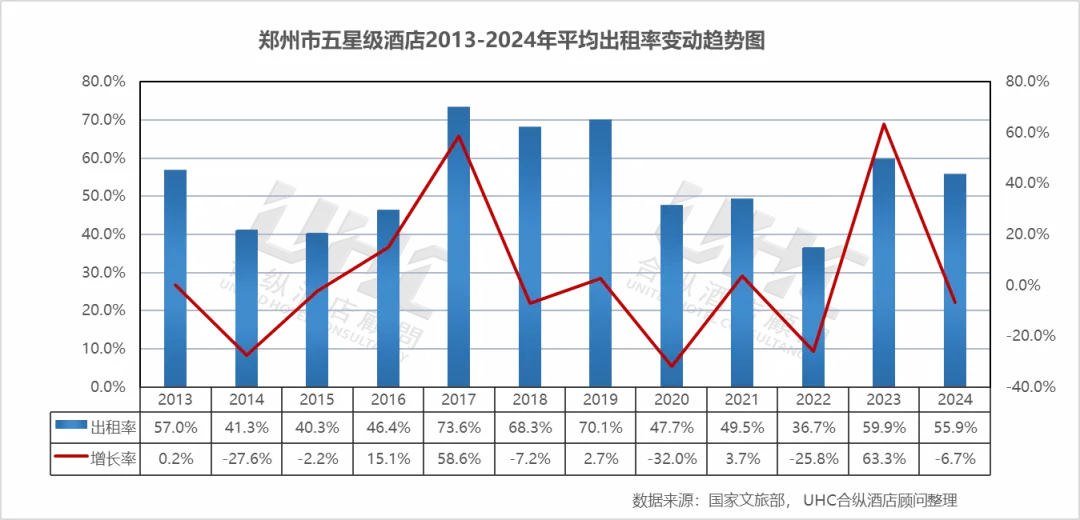 出租率方面,2013-2024年的平均出租率为53.9%,其中最高为2017年的73.6%,最低为2022年的36.7%。从变动情况来看,2013-2016年出租率从57.0%大幅下滑至46.4%,反映市场供需严重失衡。2017年实现V型反转,飙升至73.6%(+58.6%),主要受益于上合组织总理会议等重大活动的带动。2018-2019年维持在68%-70%的高位,显示市场进入相对成熟期。2020年骤降至47.68%(-32.0%),为历史低点。2021-2022年在低位徘徊,2023年强劲反弹至59.9%(+63.3%),主要受积压出行需求与郑州国际会展中心活动恢复推动。2024年回落至55.9%(-6.7%),显示复苏进入平台期,但仍需观察后续走势。