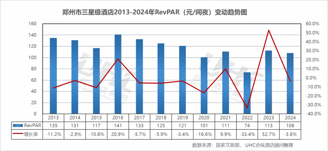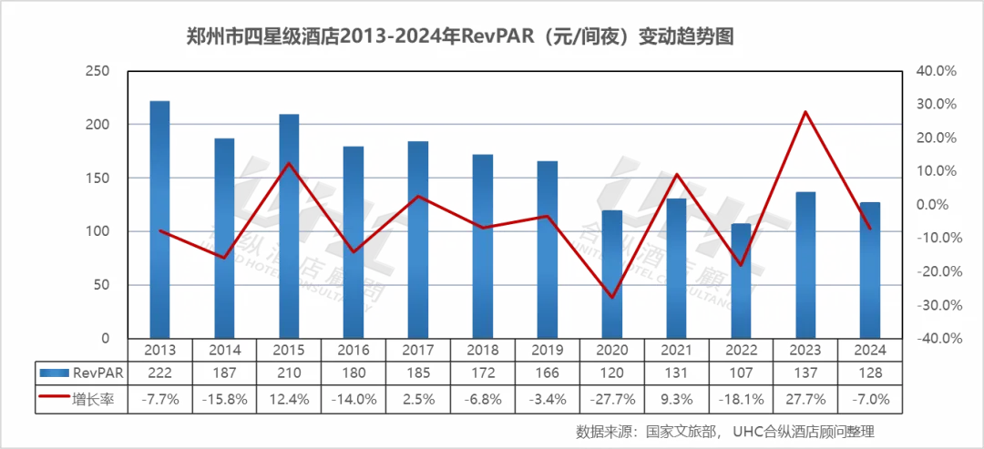 RevPAR方面,2013-2024年的平均RevPAR为162元,其中最高为2013年的222元,最低为2022年的107元。从变动情况来看,RevPAR从2013年的222元震荡走低,2014-2015年在187-210元区间波动,2016-2019年持续下行至166元。2020年暴跌至120元(-31.9%),2022年进一步下探至107元的历史低点。2023年RevPAR修复至137元(+27.7%),2024年再次回落至128元(-7.0%),不仅未能收复疫情失地,更创2013年以来次低水平。四星级酒店在郑州酒店市场中的地位正面临前所未有的挑战,亟需通过产品升级与服务创新寻求突破。