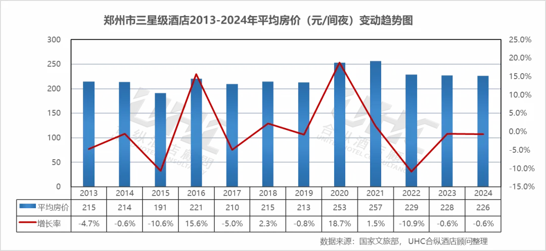 郑州市三星级酒店2013-2024年的平均房价为223元,其中最高为2021年的257元,最低为2015年的191元。从变动情况来看,2013-2015年房价从215元下滑至191元,2016年反弹至221元后,2017-2019年在210-215元区间窄幅波动,市场表现相对平稳。2020年房价逆势大涨18.7%至253元,这一现象通常与供给侧收缩(大量三星级酒店关停或升级导致样本结构变化)有关。2021年微升至257元的历史峰值,2022-2024年逐步回落至226-229元区间,2024年最新数据为226元,同比下降0.6%,显示出三星级酒店市场在剧烈波动后逐步趋于稳定,但整体价格中枢已明显下移。