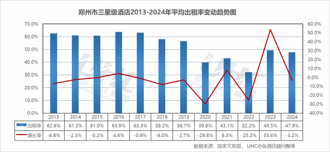 出租率方面,2013-2024年的平均出租率为53.3%,其中最高为2016年的63.9%,最低为2022年的32.2%。从变动情况来看,2013-2016年出租率从62.6%攀升至63.9%的阶段性高点,反映了郑州作为区域交通枢纽吸引力的增强。2017-2019年出租率维持在56%-64%的区间,尽管此时房价在下降,说明当时酒店采取了"牺牲房价换出租率"的经营策略。2020年出租率骤降至39.8%的冰点,2021年反弹至43.1%,2022年再次下探至32.2%的历史最低点。2023年实现了49.5%的跨越式回升,同比涨幅高达53.6%,出租率恢复至2013年水平。2024年稳定在47.9%,虽略有回落,但基本回归市场常态,预示市场进入了稳健的常态化运营期。
