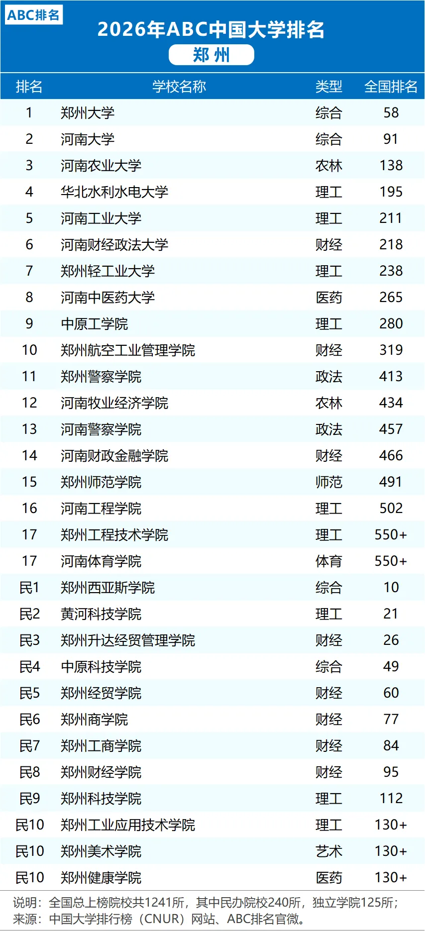 本文基于排名结果,整理了2026年郑州市大学排名一览表,文章仅罗列上榜院校。