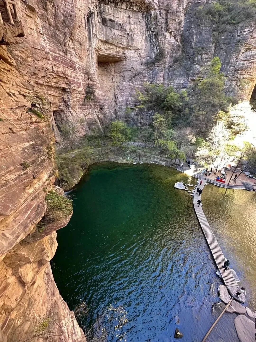 郭亮村天池天池:挂壁公路终点的高山湖泊,碧水映红岩,倒影出片率极高。
