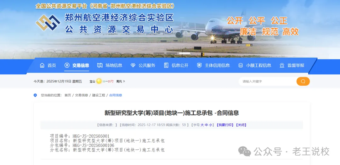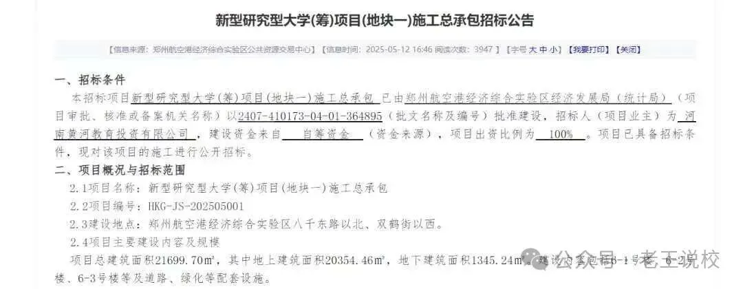 2025年12月17日,郑州航空港经济综合实验区公共资源交易中心发布了一则合同信息,上面显示项目的名称竟然是“新型研究型大学(筹)项目(地块一)施工总承包!也就是说河南郑州已经在开建一所新型研究型大学了。这对于河南省的考生而言无疑是一个天大的好消息。