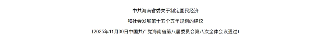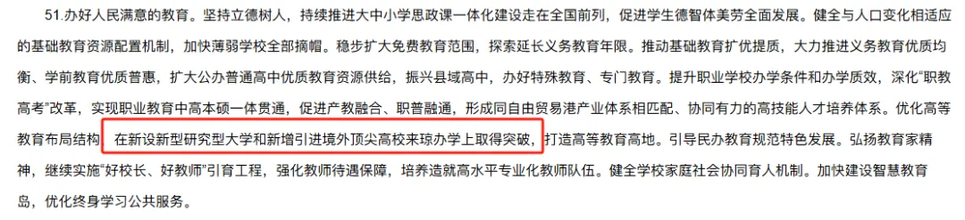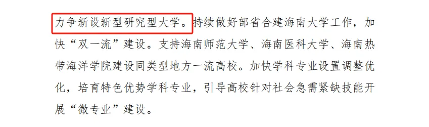 2025年11月,在《中共海南省委关于制定国民经济和社会发展第十五个五年规划的建议》中提及:优化高等教育布局结构,在新设新型研究型大学和新增引进境外顶尖高校来琼办学上取得突破,打造高等教育高地。
