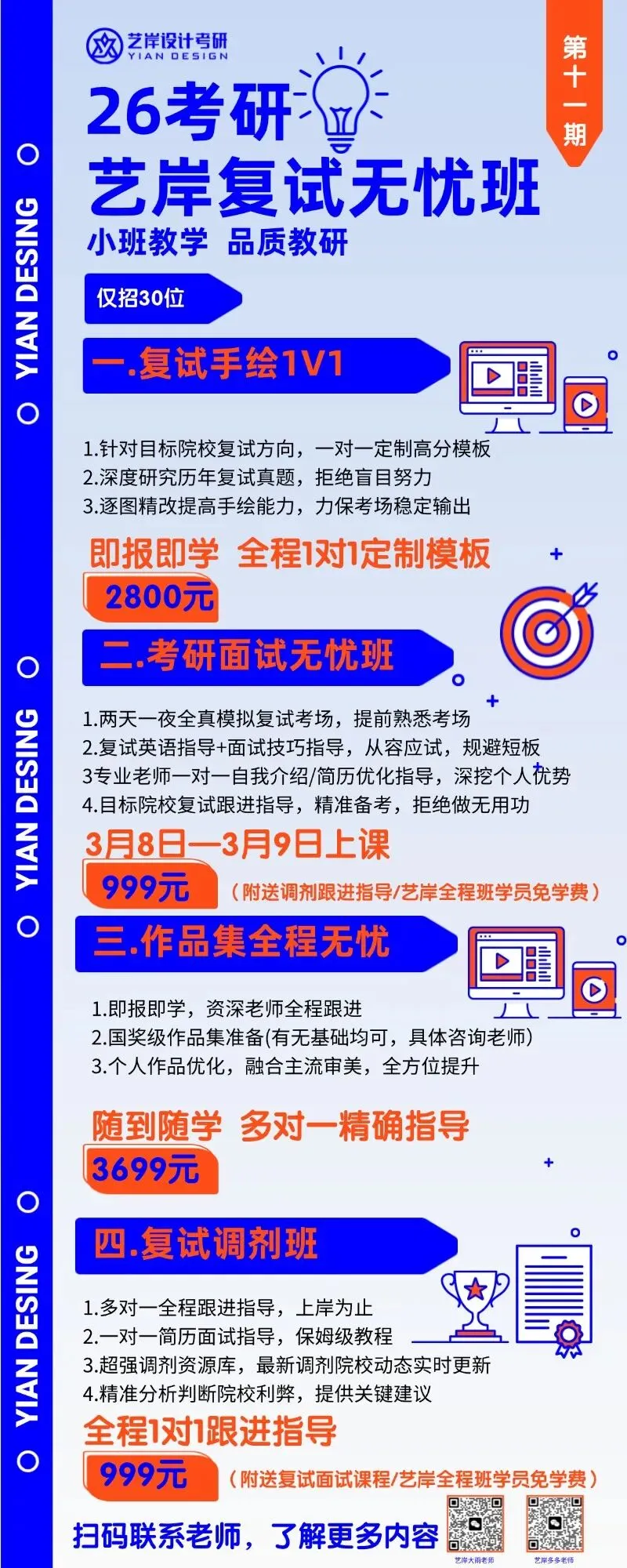 艺岸设计教育为设计类大学生提供一站式考研手绘理论、设计软件、国际竞赛、定制保研、出国留学作品集等专业技能辅导,涵盖了环境艺术设计、景观设计、工业设计、风景园林、视觉传达、数字媒体艺术设计、服装设计、美术学等艺术与设计类专业,师资主要由高校老师、知名高校博士研究生,硕士研究生、6年以上设计考研/竞赛培训经验专职讲师等组成。