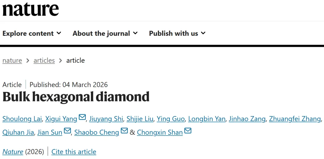 北京时间2026年3月5日0时,郑州大学金刚石材料与器件团队在国际顶级期刊《自然》(Nature)在线发表了一项重磅研究成果。论文题为“Bulk hexagonal diamond”,报道了该团队成功合成毫米级纯相六方金刚石块材,并精确解析了其晶体结构。