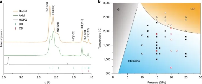 【图1:石墨的XRD谱图和P-T相图清晰划定了纯相六方金刚石的“稳定窗口”】