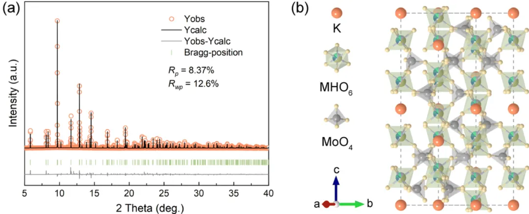图1 KMHO 的 Rietveld 精修结果及晶体结构示意图,显示其为典型 NZP 型框架结构。