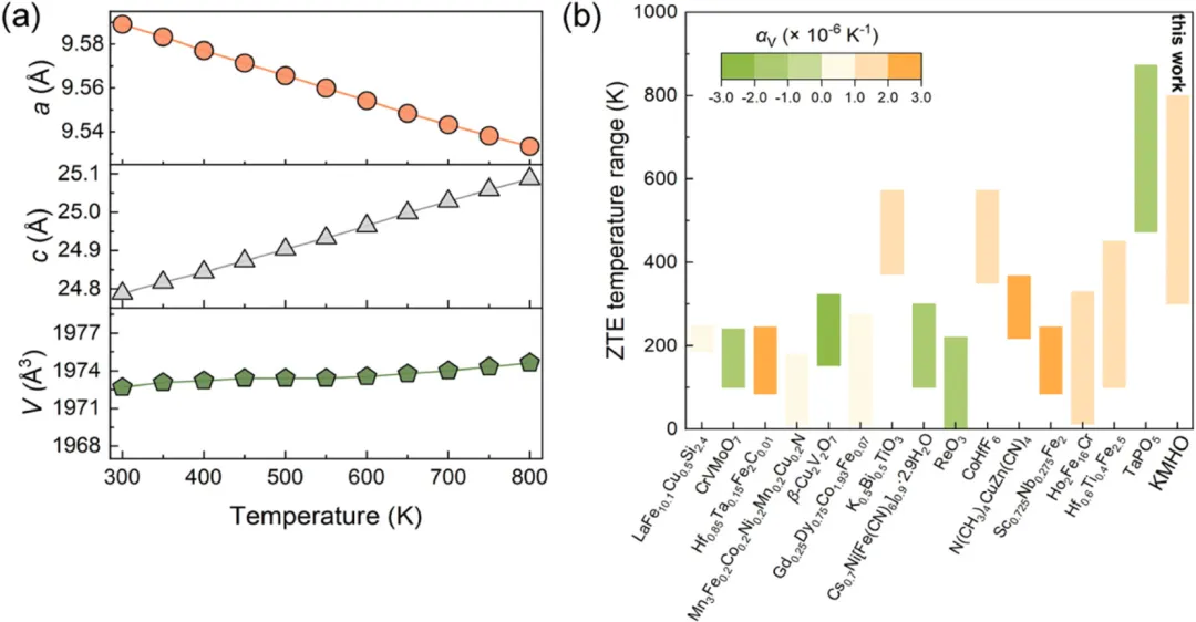 图2 KMHO 在 300–800 K 范围内的晶格参数和体积变化,直观展示其零热膨胀行为。