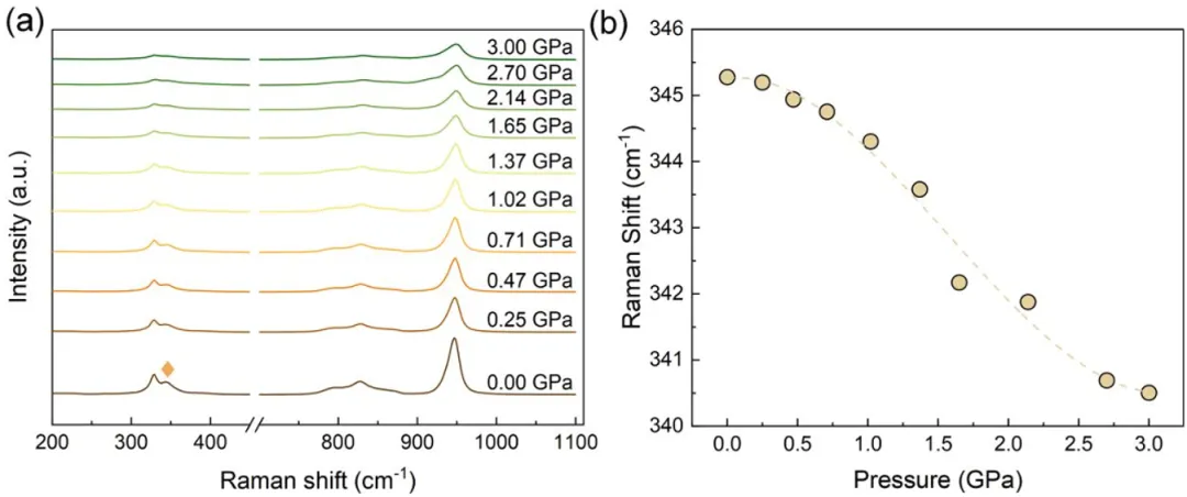 图3 高压拉曼光谱结果,揭示与多面体转动相关的声子模对负热膨胀的贡献。
