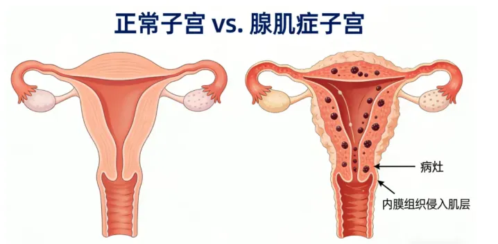 这些“迷路”的子宫内膜组织,也会随着月经周期发生“增生、出血”,但由于它们被肌肉包裹着,血液无法像正常月经那样排出体外,就会在局部形成病灶,刺激周围的肌肉组织,导致子宫弥漫性增大、变硬,并引起一系列不适症状。