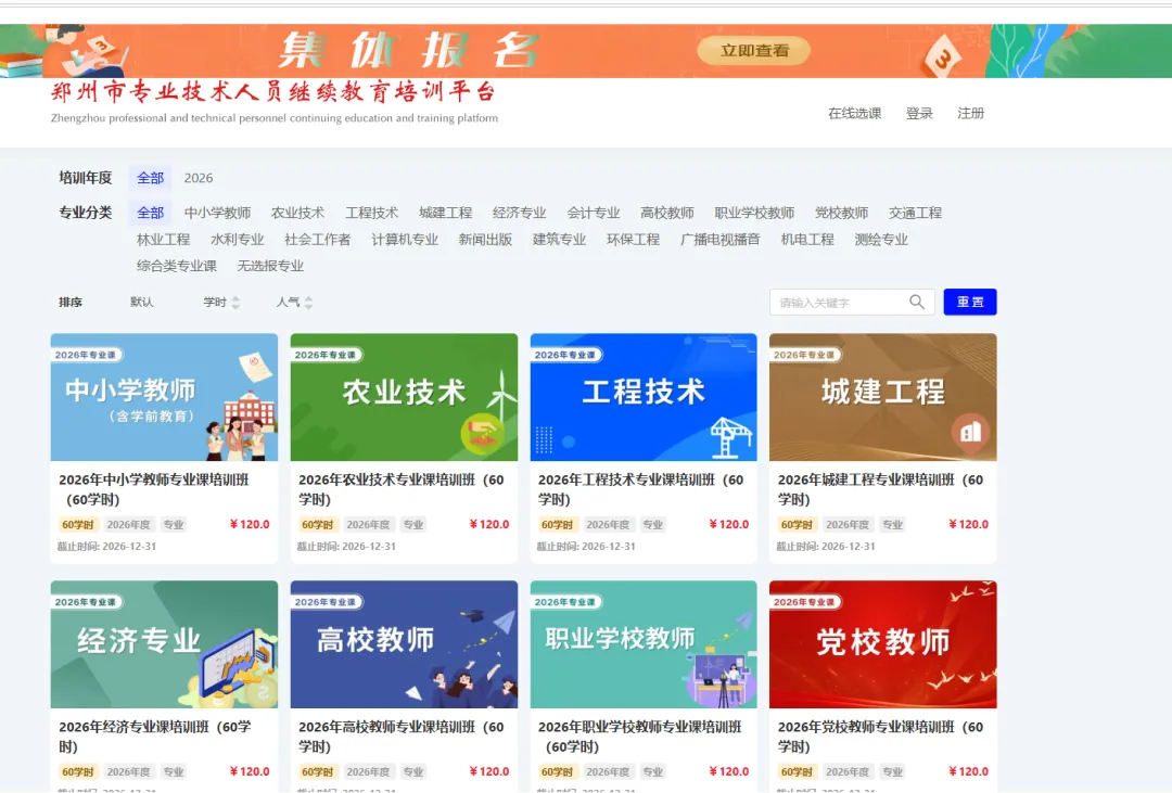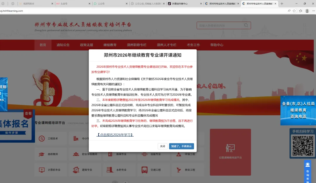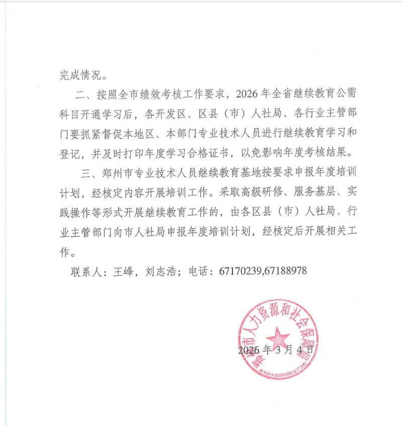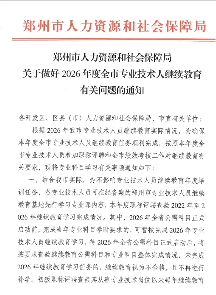 二、按照全市绩效考核工作要求,2026年全省继续教育公需科目开通学习后,各开发区、区县(市)人社局、各行业主管部门要抓紧督促本地区、本部门专业技术人员进行继续教育学习和登记,并及时打印年度学习合格证书,以免影响年度考核结果三、郑州市专业技术人员继续教育基地按要求申报年度培训计划,经核定内容开展培训工作。采取高级研修、服务基层、实践操作等形式开展继续教育工作的,由各区县(市)人社局、行业主管部门向市人社局申报年度培训计划,经核定后开展相关工作。