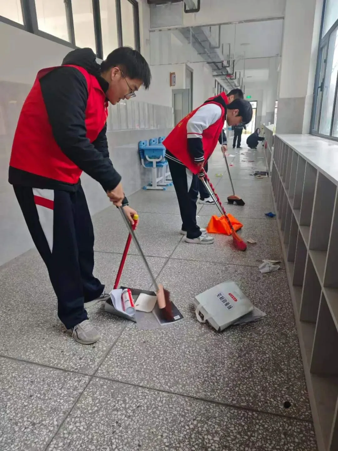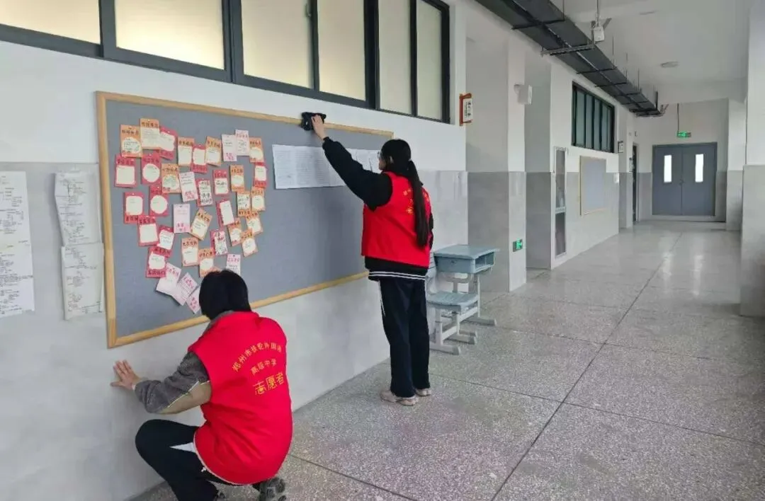 在教学楼楼道、走廊、楼梯、卫生间、窗台、扶手及公共区域,志愿者们分工明确、协作有序,认真清扫地面垃圾、纸屑、杂物,擦拭楼梯扶手、窗台、墙面宣传栏,整理清洁教室门口、走廊死角卫生,规范摆放清洁工具,维护校园公共秩序。