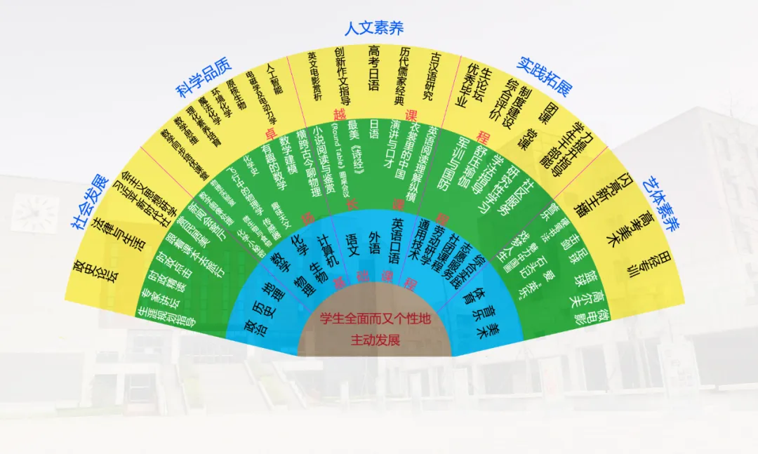 学校整体课程规划为基础课程、扬长课程、卓越课程三大层级,以满足不同层次学生的发展选择