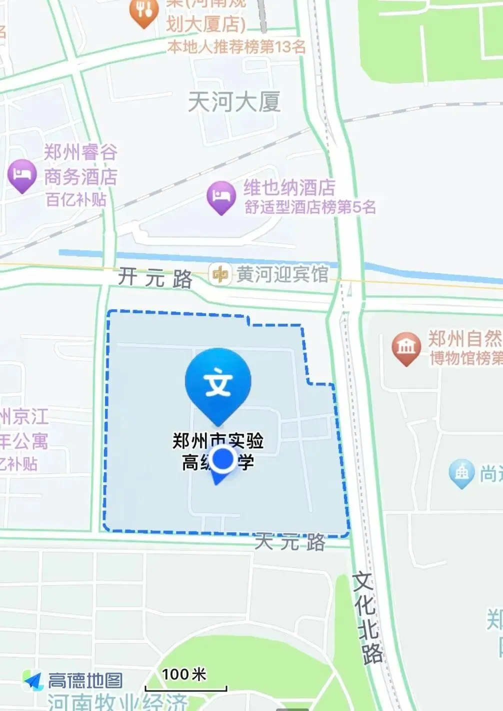 距连霍高速文化路站约2公里,处于地铁2号线和7号线交会点(黄河迎宾馆站濒临学校东门)。校园占地175亩,分为教学、生活、运动、阅览等多个功能区,花木成畦,环境幽雅。高清录播教室、数字化实验室、人工智能创客中心、天文台、画室、琴房、音乐教室、心理咨询室、体育馆、击剑馆、射箭馆、高尔夫训练场、标准运动场、五人制灯光足球场、图书中心等现代化教育教学设施一应俱全,设施先进,功能完备。