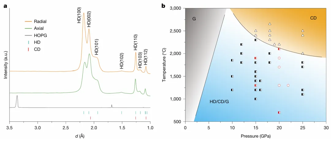 图1a:同步辐射XRD图谱清晰显示六方金刚石的特征峰;图1b:只有在特定温压窗口(红框)才能获得纯相六方金刚石。