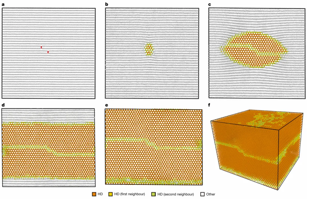 图3:模拟显示,层间键(红色)处率先成核,最终形成>99%六方结构。